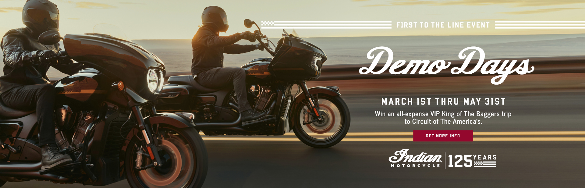 Kick off riding season by celebrating 125 years of Indian Motorcycle at the First to the Line Demo Days & Sweepstakes, happening March 1–May 31 at your local dealership. Take a demo ride on any new MY26 model and you’ll be automatically entered to win a VIP trip for two to the King of the Baggers race at Circuit of the Americas. Each visit offers more ways to ride, explore the latest lineup, and experience exclusive 125th Anniversary moments. Be first to the line—and first to what’s next.