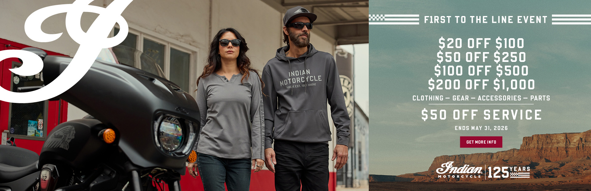 RESTRICTIONS: VALID FROM MARCH 1 – APRIL 30, 2025, SPEND $100 (IN LOCAL CURRENCY - USD OR CAD) ON QUALIFYING INDIAN MOTORCYCLE PARTS, CLOTHING, RIDING GEAR, GENERAL MERCHANDISE AND ACCESSORIES AND RECEIVE $20 (IN LOCAL CURRENCY - USD OR CAD) OFF PURCHASE. SPEND $250 (IN LOCAL CURRENCY - USD OR CAD) ON QUALIFYING INDIAN MOTORCYCLE PARTS, CLOTHING, RIDING GEAR, GENERAL MERCHANDISE AND ACCESSORIES AND RECEIVE $50 (IN LOCAL CURRENCY - USD OR CAD) OFF PURCHASE. SPEND $500 (IN LOCAL CURRENCY - USD OR CAD) ON QUALIFYING INDIAN MOTORCYCLE PARTS, CLOTHING, RIDING GEAR, GENERAL MERCHANDISE AND ACCESSORIES AND RECEIVE $100 (IN LOCAL CURRENCY - USD OR CAD) OFF PURCHASE. SPEND $1000 (IN LOCAL CURRENCY - USD OR CAD) ON QUALIFYING INDIAN MOTORCYCLE PARTS, CLOTHING, RIDING GEAR, GENERAL MERCHANDISE AND ACCESSORIES AND RECEIVE $200 (IN LOCAL CURRENCY - USD OR CAD) OFF PURCHASE. ALL EFTR PRODUCTS EXCLUDED FROM PROMOTION. APPLICABLE TAX, SHIPPING AND HANDLING FEES DO NOT COUNT TOWARD MINIMUM REQUIRED PURCHASE AMOUNT. DISCOUNT IS APPLIED AFTER APPLICABLE TAX, SHIPPING AND HANDLING FEES ARE ADDED. APPLICABLE TAX, SHIPPING AND HANDLING FEES DO NOT QUALIFY FOR DISCOUNT AND ARE THE RESPONSIBILITY OF THE PURCHASING CONSUMER. OFFER IS VALID ONLINE AT INDIANMOTORCYCLE.COM, AND IN-STORE AT AUTHORIZED INDIAN MOTORCYCLE DEALERSHIPS IN CANADA AND THE UNITED STATES. OFFERS MAY ONLY BE COMBINED WITH OTHER PARTS, GARAGE, GARMENTS & ACCESSORIES (“PG&A”), SERVICE DISCOUNTS, OFFERS OR PROMOTIONS. WHILE SUPPLIES LAST. OFFER HAS NO CASH VALUE AND CANNOT BE APPLIED TO PAST TRANSACTIONS. CONDITIONS AND RESTRICTIONS APPLY. FOR COMPLETE DETAILS ON THIS OFFER, VISIT INDIANMOTORCYCLE.COM/EN-US/SPECIAL-OFFERS/
