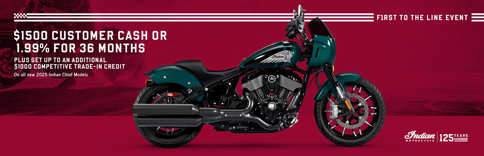 ****2025 Indian Springfield, Chieftain, Roadmaster, PowerPlus Family, or Chief Models Financing: 1.99% APR for 36 Months and $0 Down This is a limited time offer which is valid for the purchase of selected qualifying models and is subject to credit approval on qualified purchases financed during this program. Offer may not be combined with certain other offers (specifically trade-in credit or customer cash), is subject to change and may be extended or terminated without further notice. Offer valid on select new 2025 models (excludes Elites): MY25 Indian Springfield models, MY25 Chieftain models, MY25 Roadmaster models, MY25 PowerPlus family (Chieftain PowerPlus, Roadmaster PowerPlus, Indian Challenger, or Indian Pursuit), or MY25 Chief models (2025 Indian Chief, Chief Bobber, Super Chief and Sport Chief models). Monthly payment and cost of borrowing will vary depending on amount borrowed and down payment/trade. Minimum financing amount varies, check with your Indian Motorcycle dealership for minimum financing details. Example: $14,999 financed at 1.99% APR over 36 months = 36 monthly payments of $386.59. Financed amount of $13,499 with 10% down payment, total cost of borrowing of $418.14, and a total obligation of $13,917.14. An example of monthly payments required on a 36-month term at 1.99% APR is $28.64 per $1,000 financed. Monthly payment examples do not include taxes, title, license, or other fees.Offer only valid to qualified customers, not all customers will qualify, other offers available, see dealer for details. Excludes all Elite Models. Offer Valid: April 1 – 30, 2026.