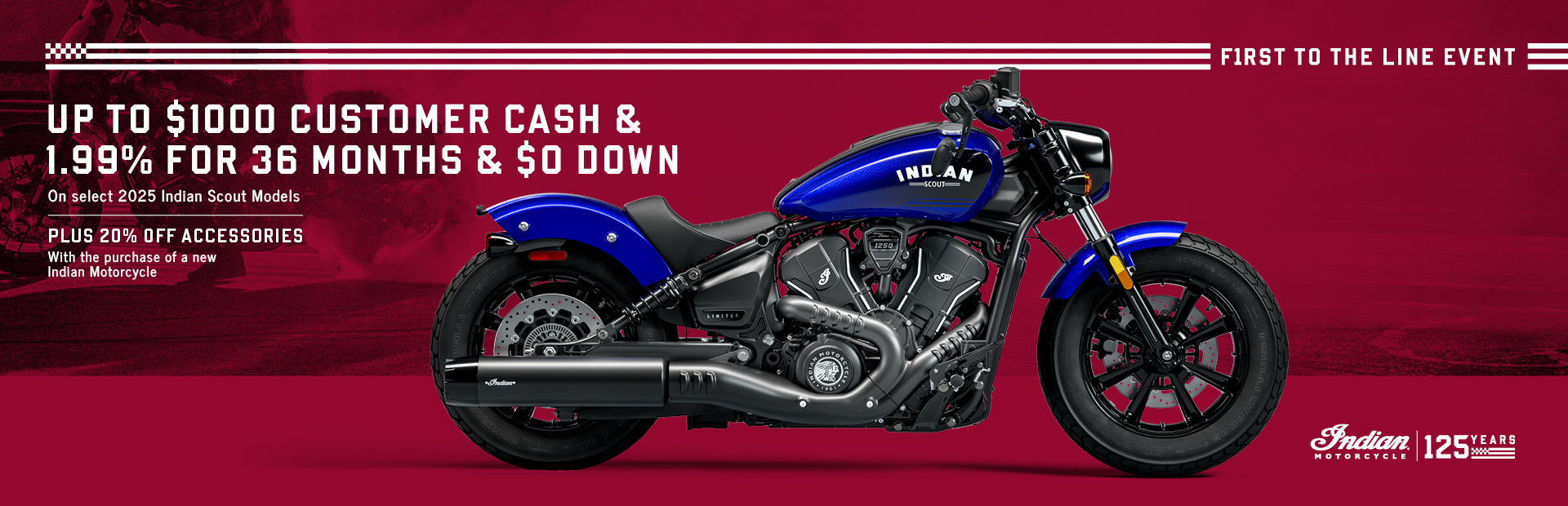 This is a limited time offer which is valid for the purchase of selected qualifying models and is subject to credit approval on qualified purchases financed during this program. Offer may be combined with certain other offers (specifically customer cash), is subject to change and may be extended or terminated without further notice. Offer valid on new MY24 FTR models, and MY25 Scout models (1250 and Scout Sixty – excludes Scout Bobber Sixty). Monthly payment and cost of borrowing will vary depending on amount borrowed and down payment/trade. Minimum financing amount varies, check with your Indian Motorcycle dealership for minimum financing details. Example: $30,999 financed at 1.99% APR over 36 months = 36 monthly payments of $799; financed amount of $27,899 with 10% down payment, total cost of borrowing of $864 and a total obligation of $28,763. An example of monthly payments required on a 36-month term at 1.99% APR is $28.64 per $1,000 financed. Monthly payment examples do not include taxes, title, and other fees. Offer only valid to qualified customers, not all customers will qualify, other offers available, see dealer for details. Excludes all Elite Models. Offer Valid: April 1 – 30, 2026.