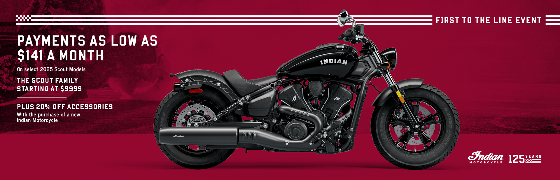 Promotion: Payments as low as $141/Month. Plus, 20% off accessories with the purchase of a new Indian Motorcycle.